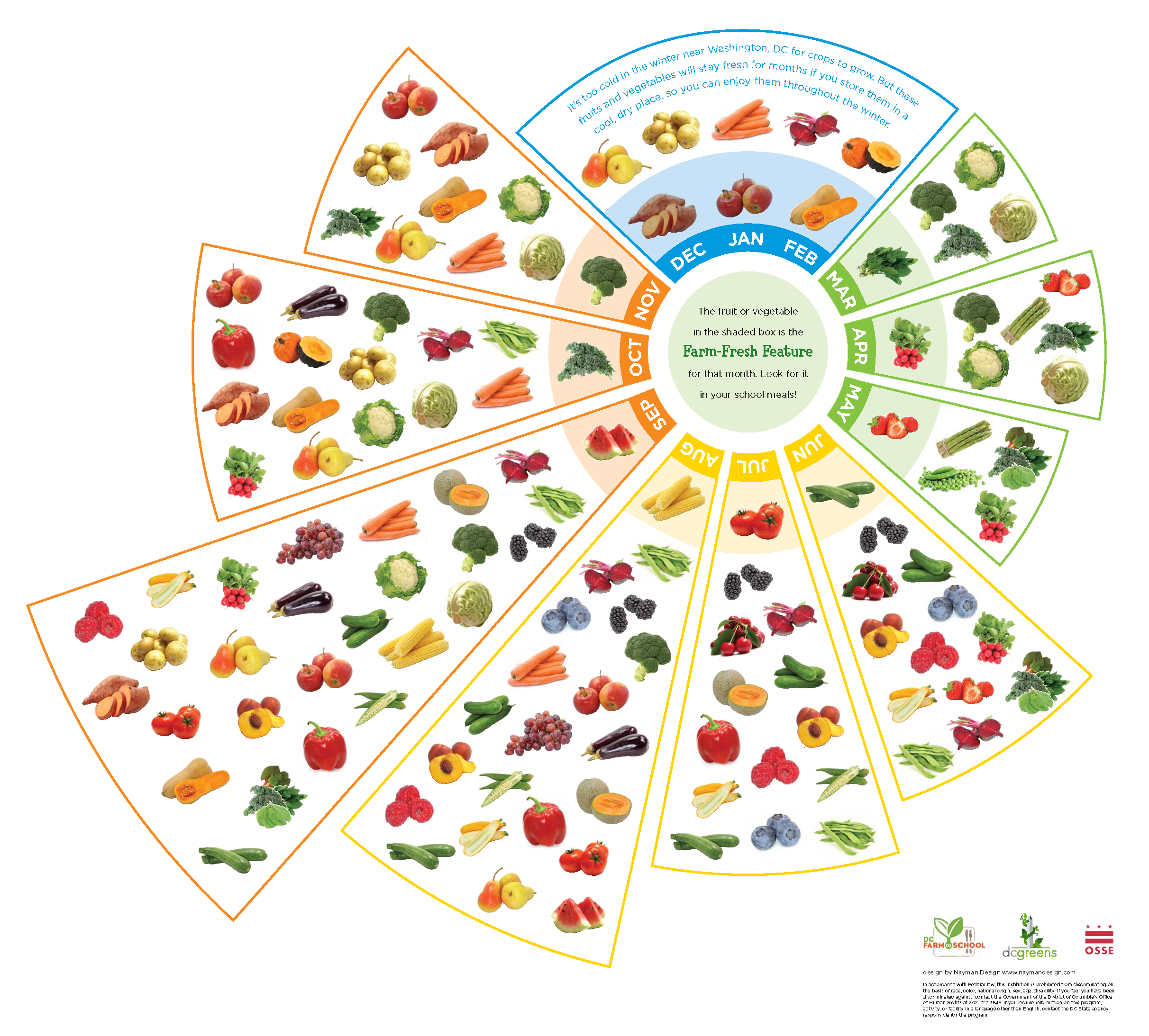 There are many benefits to purchasing and eating seasonal produce. In-season produce is cheaper, fresher, and tastier. Produce typically tastes better right after it is harvested, rather than after being stored for a while. The seasonality wheel below shows when produce is in season in Washington, D.C., and the surrounding area.
